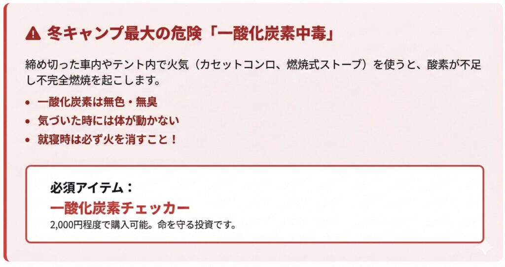 テント内や車内でストーブを使う際は、必ず一酸化炭素チェッカーを使い、常に換気を確保してください。一酸化炭素は「無臭」のまま意識を失うのが恐ろしい点です。
