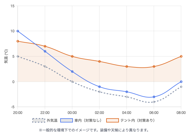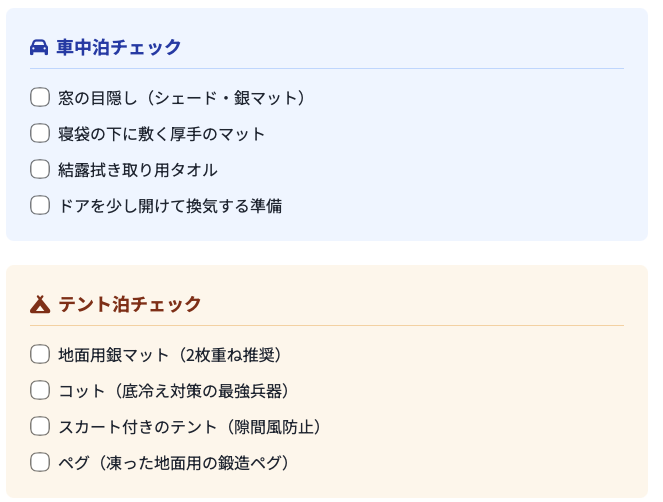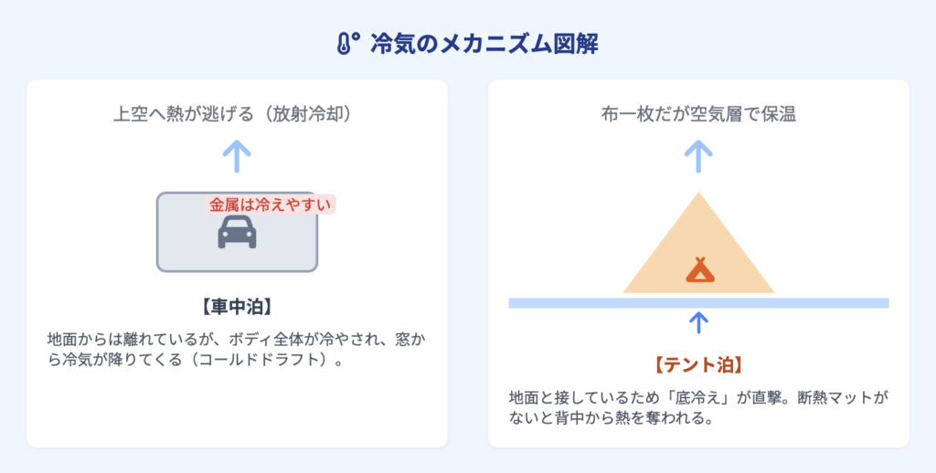 テント泊は地面と接しているため、底冷え対策が特に重要。一方、車中泊は地面から離れていますが、金属ボディが放射冷却の影響を受けやすく、窓から冷気が侵入するリスクも。