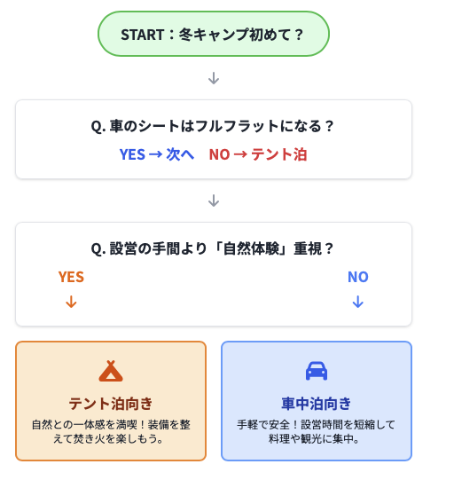 冬キャンプで車中泊とテント泊、どっちが暖かい? 徹底比較&失敗しない選び方
