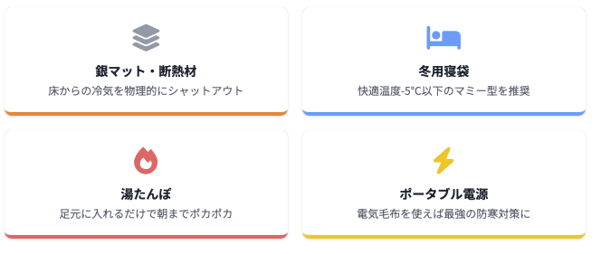 これらはすべて「暖かく眠る」ための必須アイテムであり、初心者が最初に揃えるべき装備です。