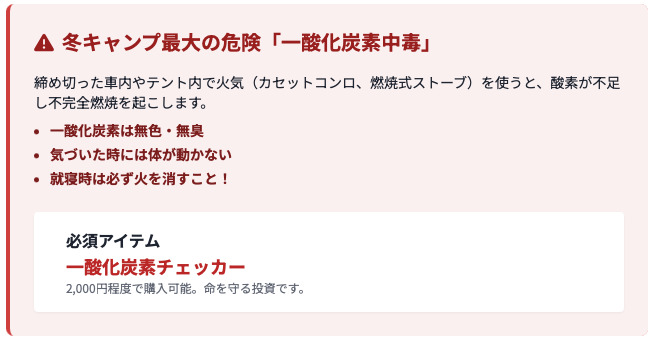 • 一酸化炭素中毒:ストーブや火器使用時は必ず換気。一酸化炭素チェッカーを常備。