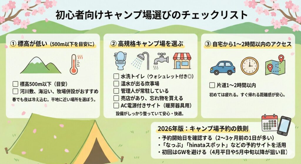 「標高・設備・距離」の3つが判断基準です。標高500m以下のキャンプ場を選ぶと夜間の冷え込みリスクを下げられます。トイレ・シャワー・炊事場が整った高規格キャンプ場なら、初心者でも安心して過ごせます。また、自宅から1〜2時間以内の距離なら、万が一トラブルがあっても帰宅できる安心感があります。GW期間は混雑するため、初回は4月の平日か5月中旬以降の週末を狙うのがおすすめです。