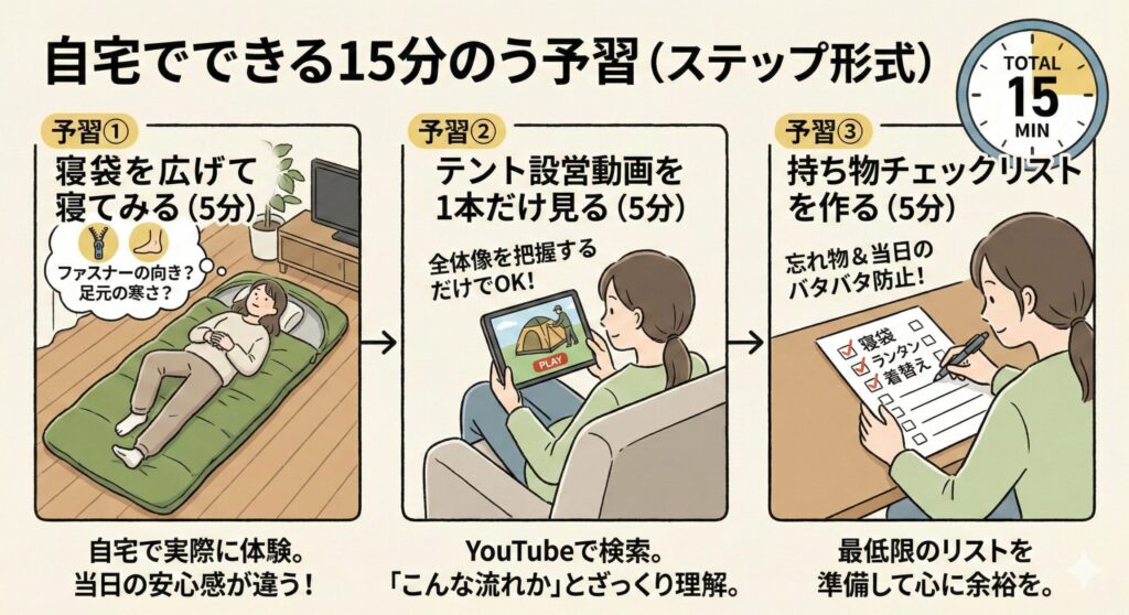 3つの「15分練習」がおすすめです。①寝袋を広げて実際に入ってみる——ファスナーの開け方や足元の感覚を暗闇の本番前に確認できます。②設営予定のテントの動画をYouTubeで1本見る——細かく覚える必要はなく、全体の流れを頭に入れるだけで当日の作業スピードが格段に上がります。③持ち物チェックリストを作る——着替え・雨具・常備薬・モバイルバッテリーなど、忘れがちなものを事前にリスト化しておくと安心です。