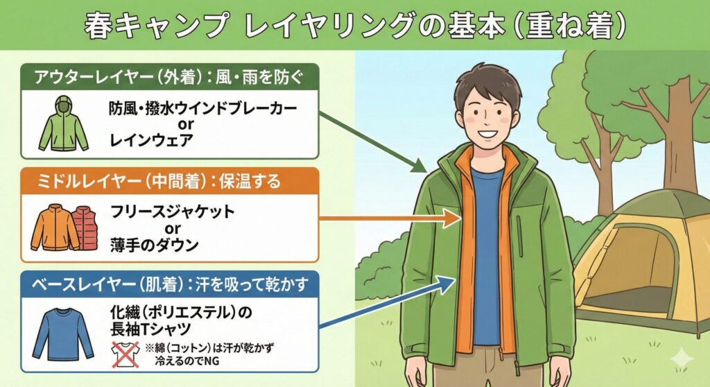 「レイヤリング(重ね着)」が正解です。春は日中と夜間の気温差が10〜15℃以上になることも珍しくなく、「昼間暖かかったから大丈夫」という油断が夜中に凍える事態を招きます。基本の組み合わせは、化繊の長袖Tシャツ(ベース)+フリースやダウン(ミドル)+防風・撥水のアウターの3層構造。防寒着は「多すぎるかな?」と思うくらい持っていくのが正解です。なお、綿(コットン)素材のTシャツは汗が乾かず体が冷えるので下着には不向きです。
