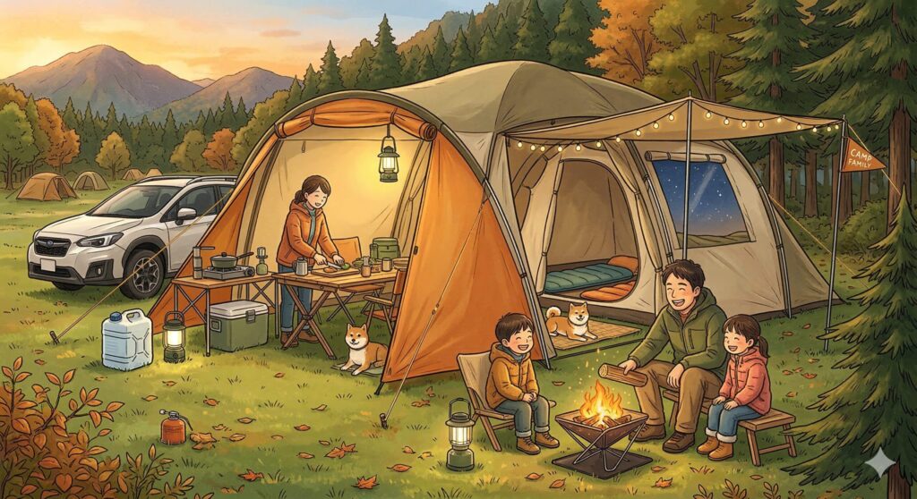 なぜ必要か:テントはキャンプの「家」です。サイズ選びを間違えると、就寝時に窮屈になったり荷物の置き場がなくなったりします。ファミリーキャンプでは「家族の人数+2」のサイズが基本とされています。4人家族なら6人用テントを選ぶくらいの余裕が快適さを生みます。