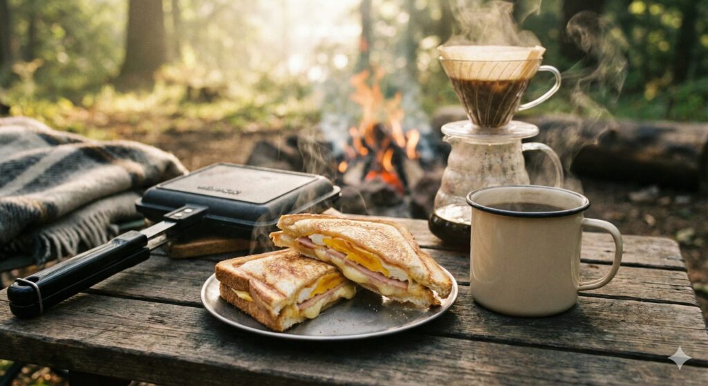 CHUMSのホットサンドクッカーで焼く、アツアツのチーズサンド。焼ける香りが立ち上る中、ハンドドリップコーヒーを淹れる。それだけで、キャンプの朝が特別な時間に変わります。