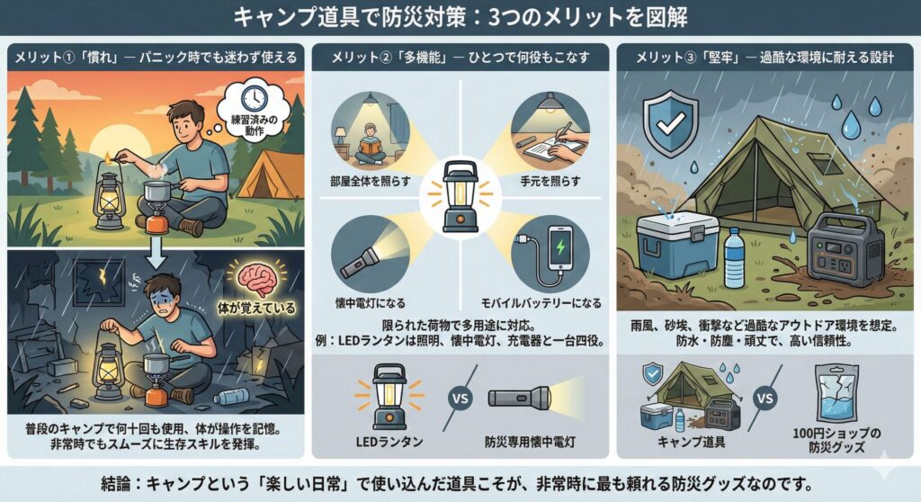 つまり、キャンプという「楽しい日常」で使い込んだ道具こそが、非常時に最も頼れる防災グッズなのです。