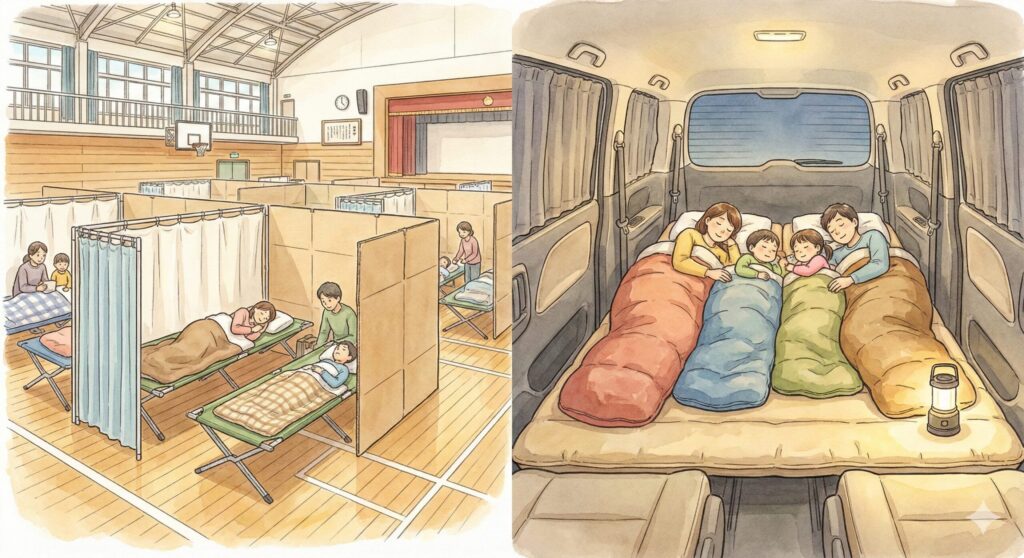 災害時に意外と深刻なのが「眠れない」問題。避難所の硬い床や寒さ、車中泊でのエコノミークラス症候群…。キャンプで培った「野外で快適に寝る技術」が、避難生活の質を大きく左右します。