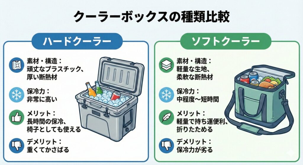 フェスにハードクーラーを持って行ったら、重くてかさばって大変だった。逆に、真夏のキャンプにソフトクーラーを持って行ったら、保冷力が足りず食材が傷んでしまった。用途に合わせた選択が重要だったと後悔…。