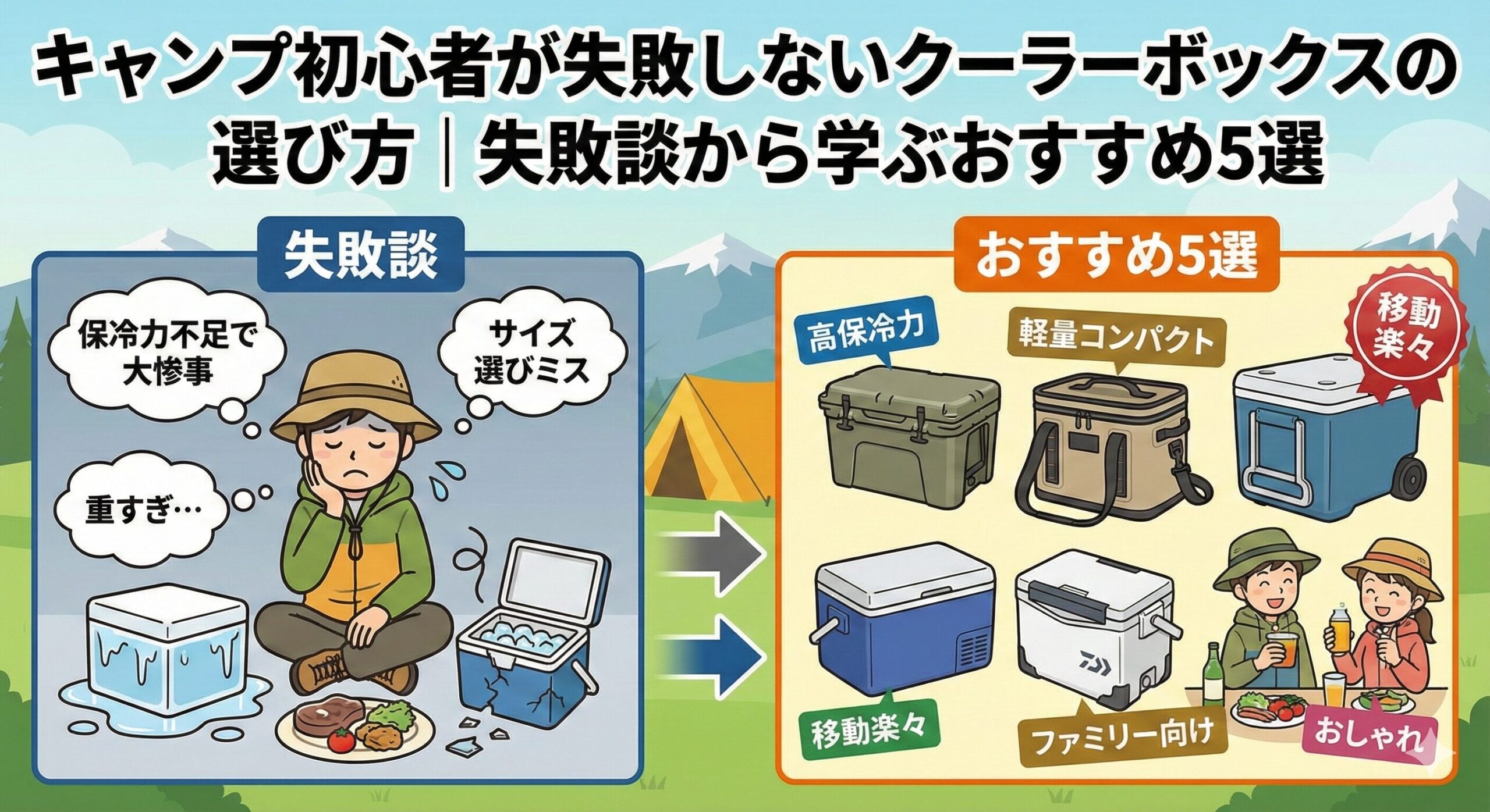 「安いから」という理由だけで選んだクーラーボックス。真夏のキャンプで使ったところ、数時間で氷が溶けてしまい、飲み物はぬるく、食材は傷みかけに…。結局、買い直すことになり、余計な出費がかかってしまいました。