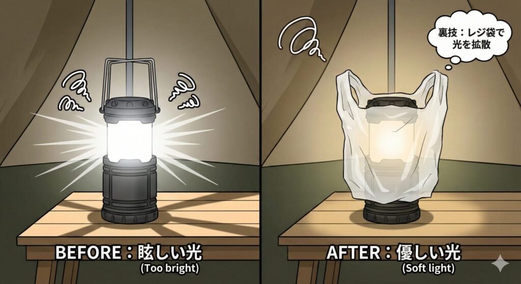 白いレジ袋や半透明のビニール袋をランタンに被せるだけで、光が柔らかく拡散されます。直接目に入る眩しさが大幅に軽減され、周囲への光漏れも抑えられます。