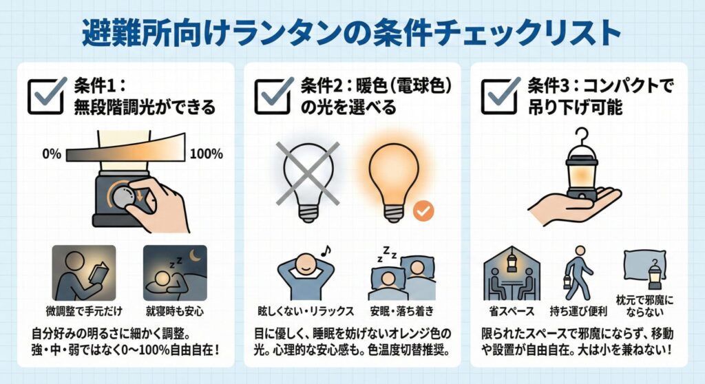では、避難所で本当に役立つランタンとはどんなものでしょうか?キャンプ経験者だからこそ押さえておきたい3つの条件を紹介します。