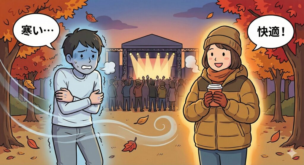 秋冬の野外フェスは、昼と夜の温度差が10℃以上になることも珍しくありません。防寒を甘く見ると、寒さで音楽に集中できず、せっかくのフェスが台無しになってしまいます。