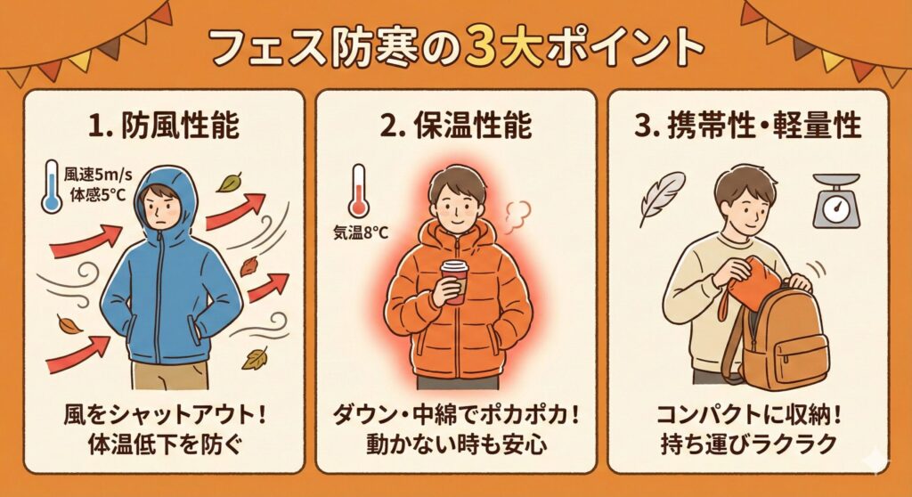 秋冬フェスの防寒ジャケット、何を基準に選ぶべきか