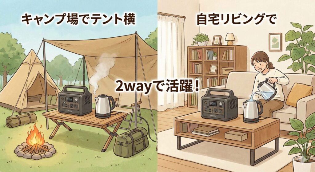 定格出力1,500W以上のポータブル電源なら、1,300Wクラスの高性能ケトルも余裕で動かせます。自宅の防災用としても、キャンプで家族分の調理をするにも安心のスペックです。