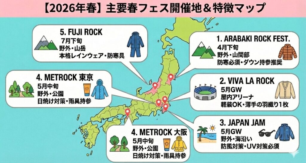 - 寒暖差リスク:日中と夜間で10〜15℃の気温差が発生することも。特に4月の東北開催フェスや山間部は要注意