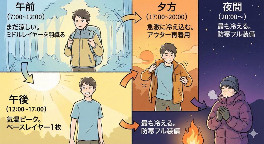 - 夜間(20時〜):最も冷える時間帯。防寒フル装備で臨む