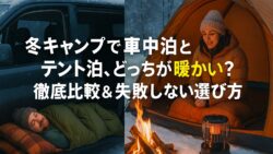 キャンプ 冬キャンプの「車中泊 vs テント泊」どっちが暖かい?プロが教える“朝まで爆睡”の正解と失敗しない選び方 冬キャンプで「車中泊」と「テント泊」どちらが暖かい?初心者向けに両者の特徴と防寒対策をわかりやすく解説。装備・結露・安全対策まで完全網羅。 2025.12.05 キャンプ