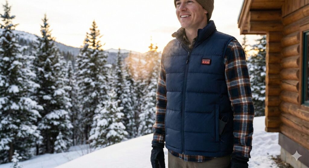 そこで最後のピースとして投入するのが、モバイルバッテリーで駆動する**「電熱ベスト」**だ。背中や首元にヒーターが内蔵されており、スイッチを入れるだけで体幹がポカポカになる。