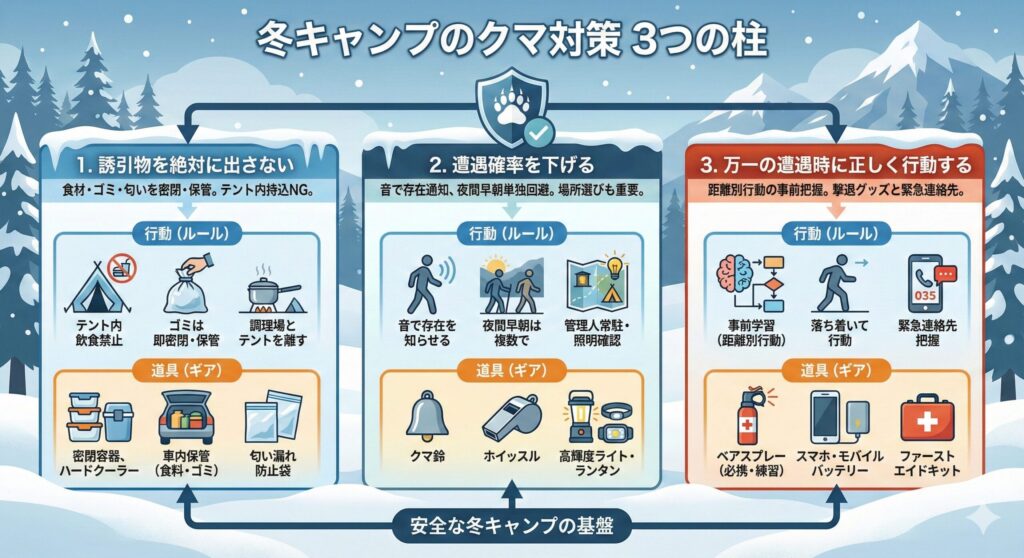 【まず結論】冬キャンプのクマ対策は3つの柱で考える