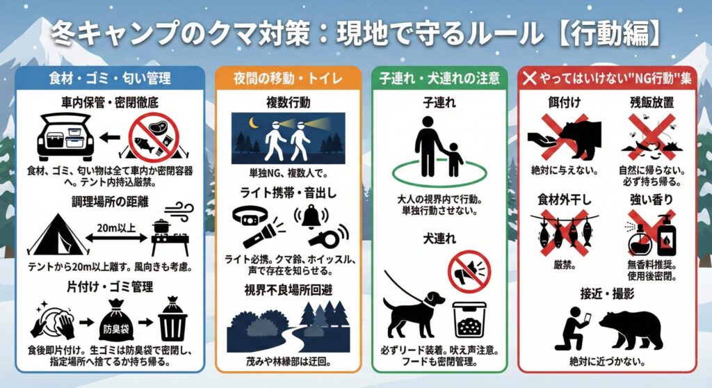 • 現地で守るべきルール(食材・ゴミ管理、夜間行動、子連れ・犬連れ時の注意)