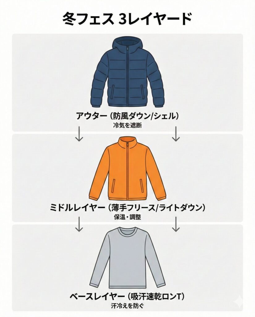 冬フェス対策として広く推奨されているのが、「1枚の分厚い服」ではなく「役割の違う服を重ねる(レイヤリング)」という考え方です。